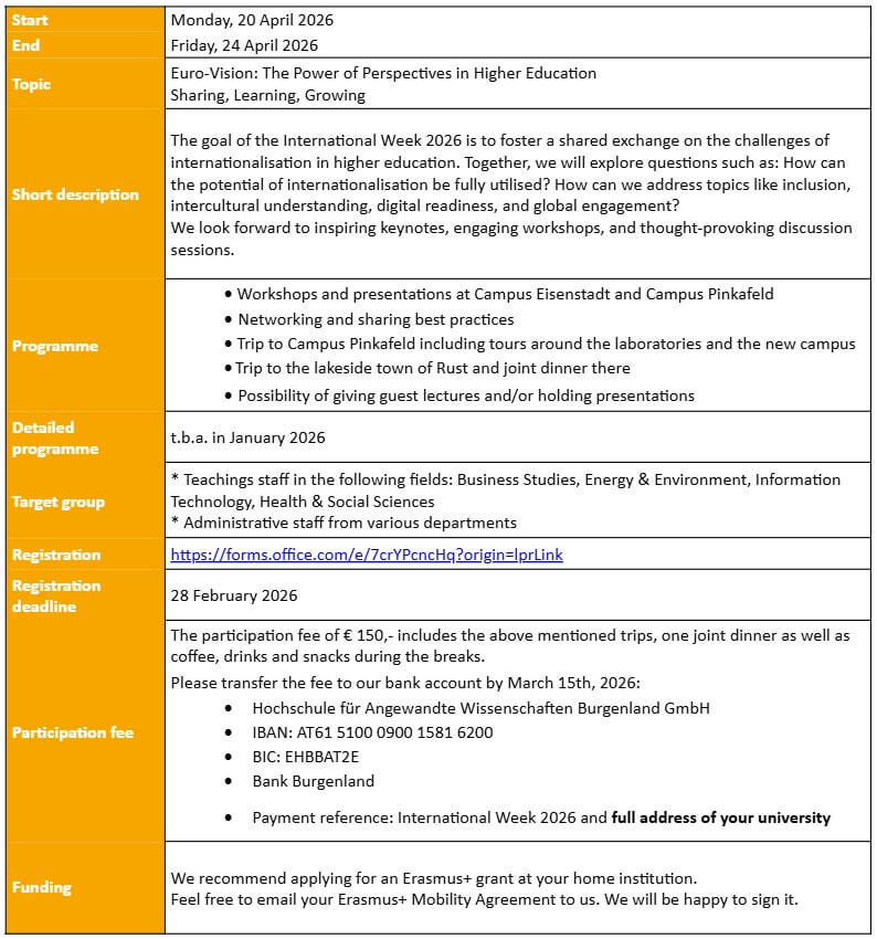 The University of Applied Sciences Burgenland invites you to its International Week on the topic of “Euro-Vision: The Power of Perspectives in Higher Education”. The goal of the International Week 2026 is to foster a shared exchange on the challenges of internationalisation in higher education and to address questions such as: How can the potential of internationalisation be fully utilised? How can we address topics like inclusion, intercultural understanding, digital readiness, and global engagement?.